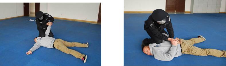 注意事项:该上铐方式一定要先对嫌疑人进行控制,控制时应为徒手状态,要用身体的重量跪压嫌疑人,在其不能反抗的前提下进行取铐、上铐动作。虽然此种方式为安全系数相对较高的上铐动作,也应提高警惕,以防受到袭击。