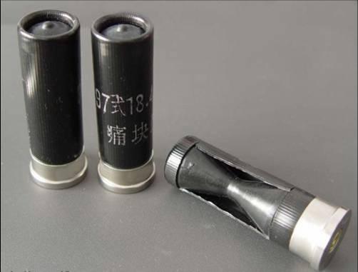 A识别:弹壳为黑色,并标有“痛快弹”字样,顶部有一圆形凸起,为手触摸标志。B构造:内装1粒直径18.7毫米的硬橡胶弹丸。C适用范围:是一种非致命性弹药,以弹头的所携带的动能来打击特定目标,适用于50米内震慑和制服特定的单个或群体目标。D作用效果:15米内直射可对着单层迷彩服人员造成中度损伤(头部裆部除外)。10米内反弹射击可对着单层迷彩服人员造成轻微度损伤(头颈裆部除外)。