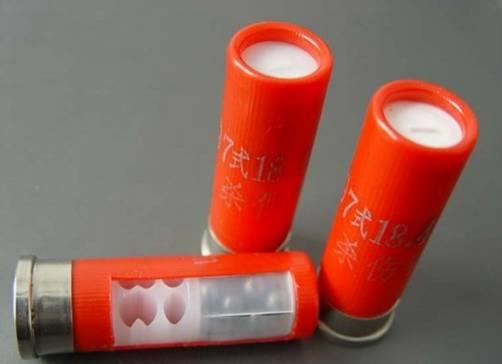 A识别:弹壳为红色,并标有“杀伤弹”字样,顶部有一道凸起横杠,为手触摸标志。B构造:内装22粒直径6毫米的铅合金弹丸。C适用范围:是一种致命性弹药,适用于近距离内杀伤制服目标。D作用效果:15米内直射可对着单层迷彩服人员造成致命性损伤。