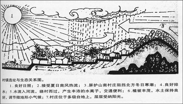 中国人讲究“天人合一”、“顺应自然”的理想,追求“依山傍水而安居”的境界。强调坐落于山脉之处,背靠山峰,左右护山环抱,前有秀峰,面临平原,流水弯曲,入收八方之气的理想景观模式。