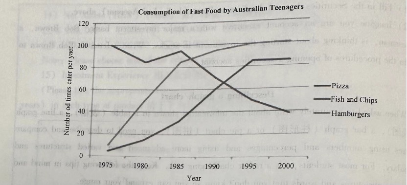 In 1975, the most popular fast food with Australian teenagers was fish and chips, being eaten100 times a year. This was far higher than pizza and hamburgers, which were consumed approximately 5 times a year. However, apart from a brief rise again from 1980 to 1985, the consumption of fish and chips gradually declined over the 25 year timescale to finish at just under 40.