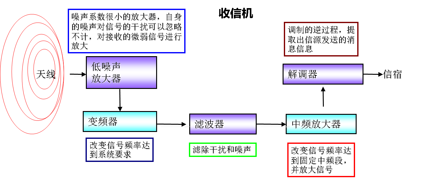 收信机:低噪声放大、下变频、滤波、解调。