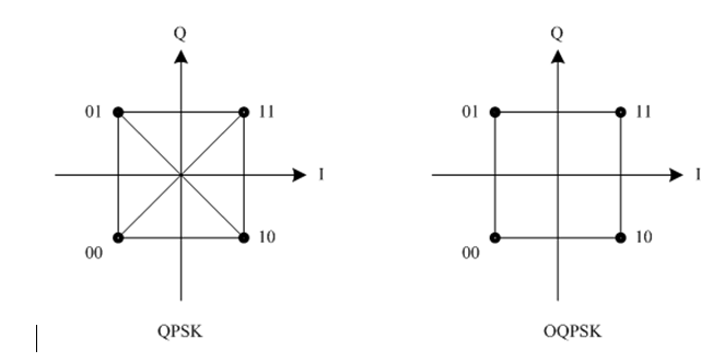 OQPSK是QPSK的改进型,它与QPSK有同样的相位关系,也是把输入码流分成两路,然后进行正交调制。不同之处在于它将同相和正交两支路的码流在时间上错开了半个码元周期。由于两支路码元半周期的偏移,每次只有一路可能发生极性翻转,不会发生两支路码元极性同时翻转的现象。因此,OQPSK信号相位只能跳变0°、±90°,不会出现180°的相位跳变。
