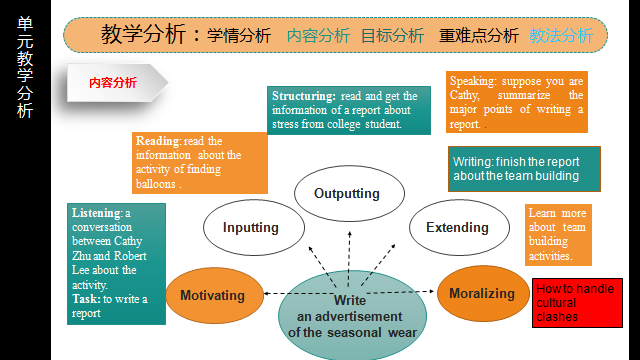 设定职场情境:撰写团队活动报告。通过输入驱动的听力和阅读、脚手架支撑的结构语篇促成输出,达成职场任务。融入思政元素,团队建设的意义和作用,学会处理不同文化背景下的交流与合作。