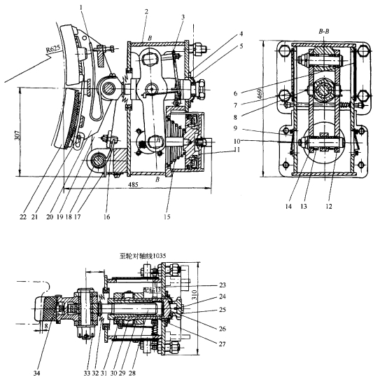 1-闸瓦定位弹簧;2-箱体;3-棘钩;4-压环;5-密封套;6-门组装(左);7-门组装(右);8-油杯;9 -护罩;10-虑尘网;11-制动缸;12-杠杆;13-隔套;14-杠杆;15-圆锥弹簧;16-扭簧卡;17-扭簧止板;18-扭转弹簧;19-闸瓦托杆;20-闸瓦托;21-闸瓦签;22-闸瓦;23-脱钩杆;24-开口销;25-手轮;26-螺盖;27-棘轮;28-传动螺杆;29-传动螺母;30-滑套;31-条簧;32-密封罩;33-螺母;34-闸瓦签圆销。