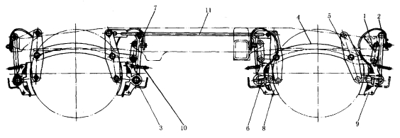 7-闸瓦托吊;8-闸瓦;9-闸瓦托10-闸瓦托弹簧;11-移动杠杆上拉杆