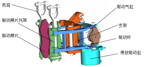 基础制动装置由制动缸、制动传动装置、闸瓦装置及闸瓦间隙调整装置组成。