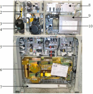 1—辅助控制模块;2—总风截断塞门;3—干燥风缸;4—辅助干燥器;5—辅助压缩机;6—电空控制单;7—气路接口;8—监控传感器接口;9—升弓钥匙塞门;10—气路接口;
