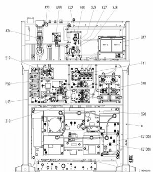 HXD3B型电力机车制动柜布置如图5-1-3所示。制动柜由以下部件组成:机架、停放制动风缸25l (A13)、塞门 (排水) (A14)、塞门(A24)、测试口 (A73)、控制单元 (EPCU) (B20)、压力传感器 (B28) 、压力传感器(B30)、压力传感器(B32)、压力传感器(B34)、停放制动模块 (B40)、处理模块 M-IPM (B46)、继电器接口模块(B47)、撒砂模块 (F41)、PSW 模块 (P50)、无人警惕模块 (S10)、辅助压缩机模块 (U43)、控制风缸(U76)、塞门 (排水) (U88)等装置与车辆一侧压缩空气系统之间通过管路建立气动连接。