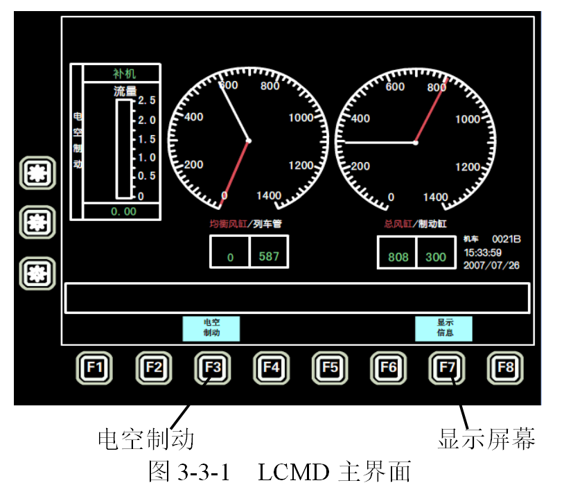 LCDM位于司机室操纵台,是人机接口,通过它可进行本机/补机,均衡风缸定压,列车管投入/切除,阶段缓解/一次缓解,补风/不补风,CCBII系统自检,风表值标定,故障查询等功能的选择和应用。CCB II 制动系统可通过制动显示屏(LCDM)在本机状态(制动管投入或切除)或在补机状态(制动管切除)设置。