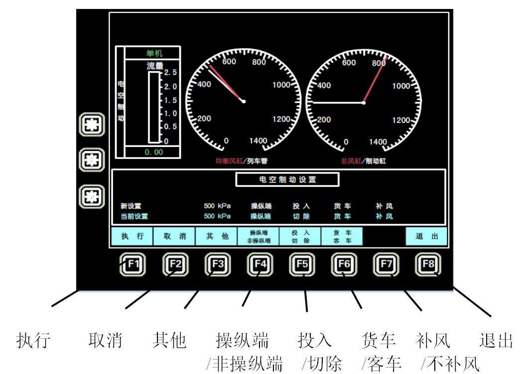 CCB II 制动系统通过制动显示屏(LCDM)的8个功能健F1~F8如图3-3-1主界面、图3-3-2制动系统设置界面所示,可以进行以下六种基本设置。