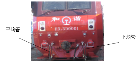 (11)牵引双管供风车体时,需将两机车的总风缸管进行连接,并开放折角塞门,再将无火机车两风泵右侧的双风管调压阀止阀和调压阀旁通阀均打到与管路垂直方向,如图5-5-16所示;