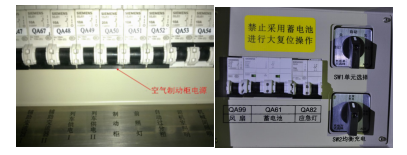 (2)制动系统断电(断主断,降弓,并取出操纵台电钥匙;断开控制电器柜上制动柜脱扣QA50;再将电源柜上蓄电池脱扣QA61断开),自动开关位置如图5-5-9所示;