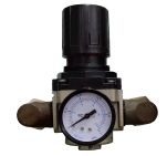 当调压阀左侧通入压缩空气时,由于调整弹簧的作用,膜板下凹,通过阀杆顶开进风, 使空气经进风阀口通向右侧输出,同时经下阀体上的平衡小孔进入膜板下方中央气室。当输出压力逐渐增高,则膜板上下方压力差逐渐减小,膜板将渐趋平衡,进风阀逐渐上移。在输出压力与整定压力相等时,进风阀口关闭。该结构能使输出端的漏泄得以补充,同时在输出压力高于整定值时,膜板上凸,打开溢流阀,使多余的压缩空气排出,直至平衡为止。整定值是通过手轮旋转来给定,顺时针旋转为增高,反之为降低。下阀体上有供装压力表的管座,可装压力表,以便随时观察。压力调好后,应将紧固螺母拧紧,以保证整定压力值的准确无误。根据安装要求,代号53、54 的调压阀之阀体上不装压力表。