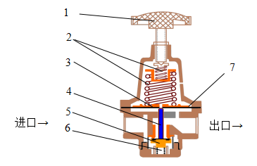 1-调整手轮;2-调压弹簧;3-溢流阀;4-顶杆;5-进风阀;6-进风阀弹簧;7-膜板