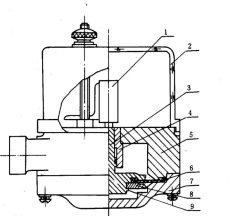 1—微动开关;2 —外罩;3 —芯杆;4 —导套;5—体;6—膜板;7—下盖;8—挡板;9 —弹性挡圈。