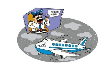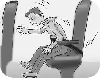 从颠簸强度可分类为轻度颠簸,中度颠簸,重度颠簸。轻度颠簸主要表现为在座位上的人员可能感觉到安全带或者肩带轻微受力,未固定的物体可能被稍微移动,行走几乎没有,不影响客舱服务。中度颠簸主要表现为在座位上的人员能感到安全带或肩带的受力,八成满的饮料从杯中溅泼出来,客舱服务受到影响,客舱内走动困难,未固定的物体被移动。重度颠簸主要表现为在座位上的人员感到安全带或肩带猛烈受力,未固定的物体前后左右摆动,抛起,无法进行客舱服务(如图所示)。