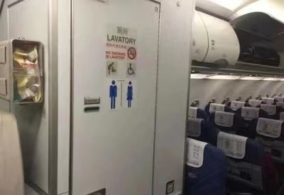 (2)如果无人用厕,用手背感觉一下门的上下部及门缝是否有热度;使用PBE:如果厕所门和四周舱壁是冷的,小心地开门(不要正对门缝,或一次开直)为了压住火焰,也可使用潮湿的毛毯打灭火苗;如果厕所门和四周舱壁是热的,用应急斧(消防斧)在门/舱壁(高温处)上劈一个洞,将灭火瓶嘴伸入洞口,并释放灭火剂:(iv)如果有烟雾从门四周溢出,用湿的毛毯或毛巾堵住缝隙;灭火成功后,关闭厕所,并通知机长。
