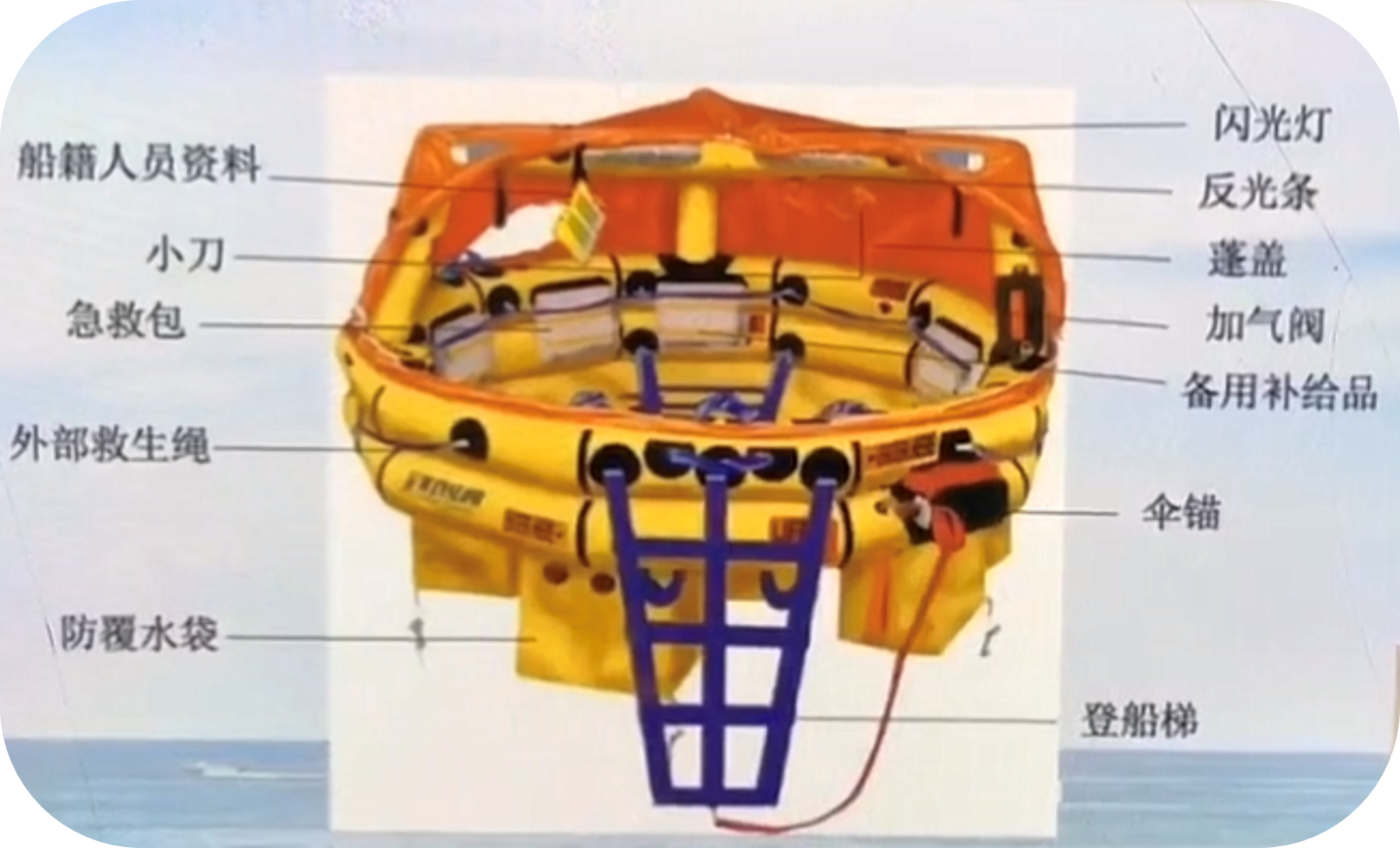 ①说明书;②刀具;③登船梯;④救生环;⑤ 救生索;⑥ 伞锚;⑦发射器固定点;⑧定位灯;⑨人工充气泵;⑩帐篷支撑棒,等等。