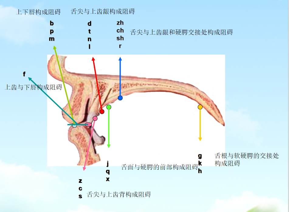 f:上门齿(两颗上门牙)与下唇内缘线接近(为了保证气流顺畅)