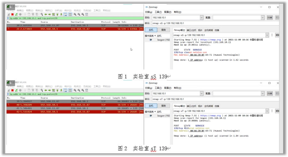 基于四幅扫描同一主机不同端口的截图,分析两种扫描方式以及端口的真实状态分别是什么?nmap扫描器的结论为何会有偏差?
