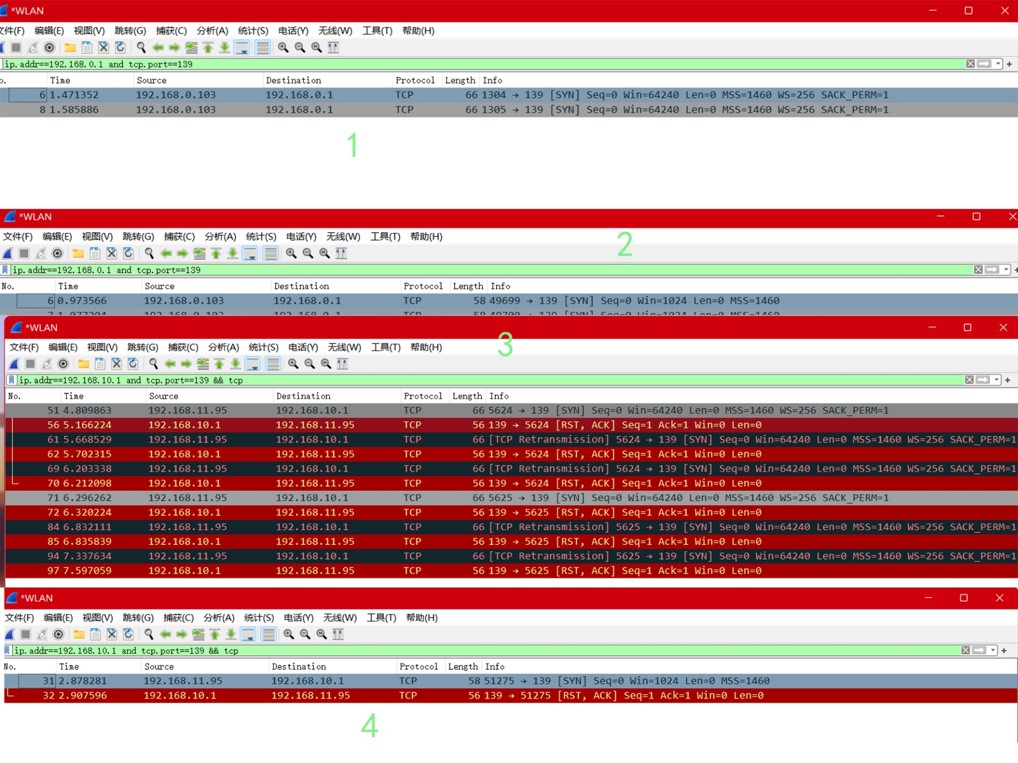 基于四幅扫描不同主机同一端口的截图,分析这四幅图分别采用了何种方式的扫描以及端口的状态各自如何?