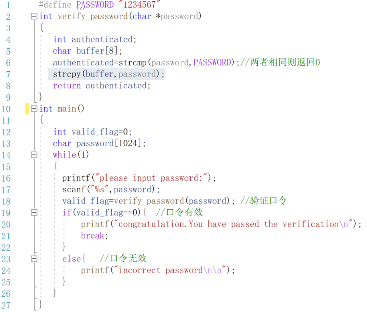 下图a为一段C语言源程序,其中,编译器为authenticated变量分配4个字节空间,为buffer变量分配8个字节空间。根据程序分析: