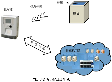 自动识别系统因应用不同其组成会有所不同,但基本都是由标签、读写器和计算机网络这三大部分组成。标签的形式很多,例如可以是条码或电子标签。读写器是读写标签信息的设备。读写器可以通过标准接口与计算机网络进行连接,计算机网络完成数据的处理、传输、通信和管理的功能。