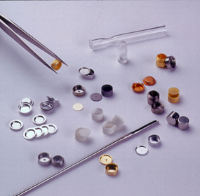 DSC用的坩埚种类很多,常见的有铝坩埚、Al2O3坩埚、铜坩埚、钢质坩埚、黄金坩埚、白金坩埚、镀金钢坩埚、石墨坩埚等。测试依照测试温度、压力、密封性、样品种类、测试效果等,选择不同种类的坩埚。对于聚合物测试一般采用铝坩埚。