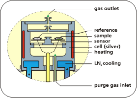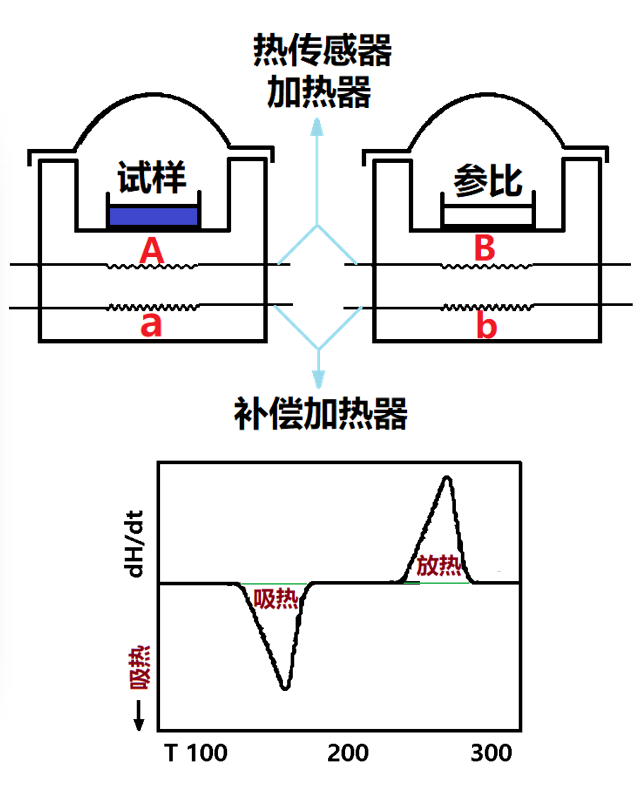 装样品和参比物的支持器是各自独立的元件,如左下图所示,在样品和参比的底部各有一个加热用的铂热电阻和一个测温用的铂传感器。它是采用动态零位平衡原理,即要求样品与参比物温度,不论样品吸热还是放热时都要维持动态零位平衡状态,即ΔT→0。