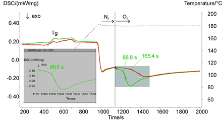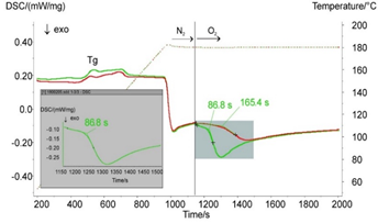 下面是关于ABS抗氧化性评价的DSC谱图,通过对测试样品改变气氛(先进行氮气测试再改用氧气),发现绿色曲线的样品在氧气气氛下存在明显的氧化反应,说明其抗氧化性不如红色曲线的样品。
