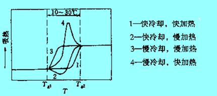 如果热历史中的冷却速率比DSC测试时的升温速率小,则表征Tg的曲线变成吸热的滞后峰(有人称之为抬头峰),如下左图中的4号曲线;反之之出现放热峰(有人称之为摆尾峰);只有冷却速率与测定速率相同或相近时,才出现标准的玻璃化转变曲线,从而表现出升温速率对DSC曲线的形状或Tg的测量有较大的影响。
