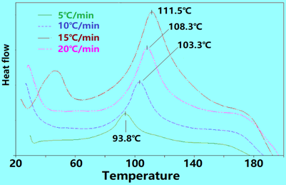 现以脲醛树脂为例,研究其在某催化剂存在下固化反应动力学。首先以不同的升温速率β对树脂-催化剂体系进行DSC扫描,如下图: