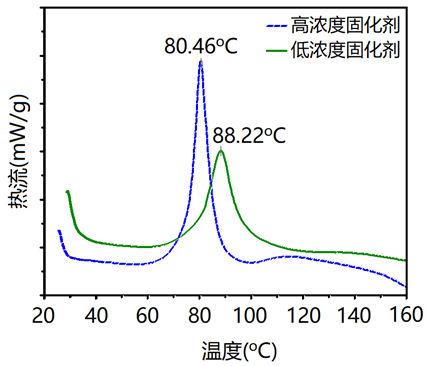 一些聚合物的氧化、分解、交联在DSC谱图上均有很明显的反映,氧化、交联反应会出现放热峰,而分解反应则出现吸热峰。如下图是用DSC研究脲醛树脂在不同固化剂用量下(蓝色5%;绿色0.9%)的固化反应结果,其固化峰值和放热量明显不同。