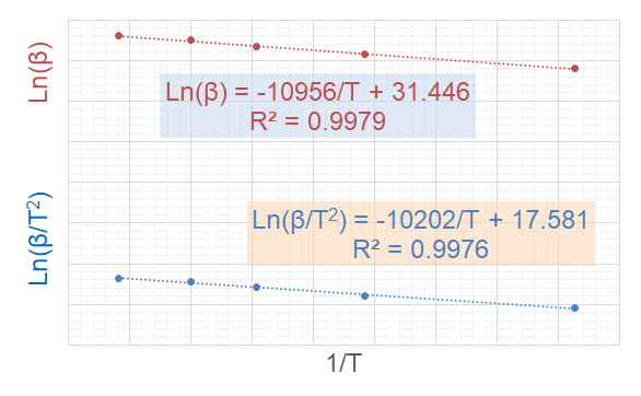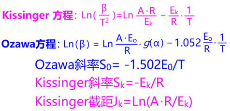 对于Kissinger方程,通过对ln(β/T2)对1/T进行回归,就可求得反应的活化能E,进而获得指前因子A;对于Ozawa方程,通过对ln(β)对1/T回归,就可求得反应的活化能E。