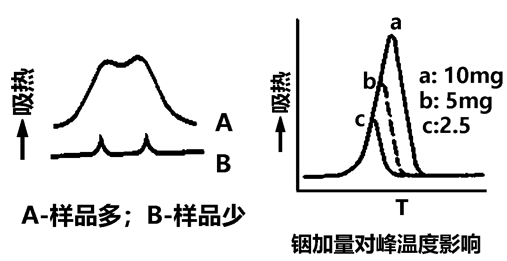 样品量少,样品的分辨率高,但灵敏度下降,一般根据样品热效应大小调节样品量,一般3—5mg,如左下图。样品量多少对所测转变温度也有影响。右下图所示是铟的量变化,随样品量增加,峰起始点温度基本不变,但峰顶温度增加,峰结束温度也提高。因此,如同类样品要相互比较其差异,最好采用相同的量。
