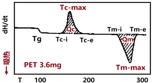 下图是一张典型的DSC图,由此可见,DSC能够直接提供的信息为:1)参与热事件物质的种类与量;2)热事件的起始温度、峰值和结束温度;3)热效应的大小和方向。