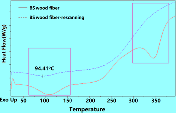 下图是蓬松木纤维进行DSC测试的结果(红实线),因为装样不密实,在105oC附近出现了假峰,对之进行二次扫描(蓝色虚线),该峰仍然出现,证明为假峰。