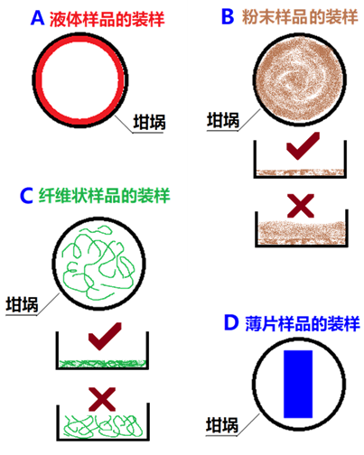 固态、液态或粘稠状样品都可用DSC分析测试。为了获得良好的测试效果,DSC装样的原则是使样品均匀密实分布在样品皿(坩埚)内,以提高传热效率,减少样品与坩埚之间的热阻,这对于固体样品尤为重要。