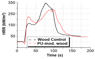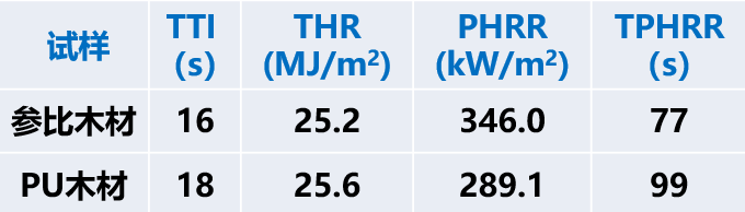 为了提高木材的力学强度和尺寸稳定性,采用发泡聚氨酯浸注到木材,实现改性。这还对木材的燃烧性能有了良好的改善,采用CONE测量参比素材和PU化木材的燃烧性能如下: