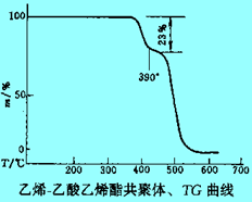 有些共聚物还可以通过TGA曲线获得组成比。如下图是乙烯—乙酸乙烯酯的共聚体TGA曲线,初期失重,是释放乙酸,每摩尔乙酸乙烯酯释放1摩尔乙酸。通过在氮气中缓慢升温,能准确计算共聚物中乙酸乙烯酯的含量。TGA法是测定该共聚物组成的最快速、最精确的方法。其结果与化学法测定结果的相对误差小于0.3%。