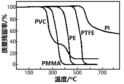 评价聚合物热稳定性最简单、方便的方法,是做不同材料的TG曲线并画在一张图上比较。如下图测定了五种聚合物的热重曲线,由下左图可知,PMMA、PE、PTFE都可以完全分解,但热稳定性依次增加。PVC稳定性较差,第一步失重阶段是脱HCl,发生在200—300℃,脱HCl后分子内形成共轭双键,热稳定性提高(TG曲线下降缓慢),直至较高温度约420℃时大分子链断裂,形成第二次失重。PMMA分解温度低是分子链中叔碳和季碳原子的键易断裂所致,PTFE是由于链中C-F键键能大,故热稳定性大大提高。聚酰亚胺PI由于含有大量的芳杂环结构,需850℃才分解40%左右,热稳定性最强。