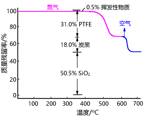 再例:下图是用SiO2和炭黑填充的聚四氟乙烯的TGA曲线,先在N2中加热至600℃,再切换成空气继续加热到700℃,烧掉炭黑,就能分别对炭黑和SiO2进行定量。