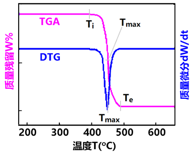 TGA曲线记录的是质量—温度,质量保留百分率—温度或失重百分率温度的关系。如果记录质量变化速率与温度的关系,就需要将质量对温度求导,称为微商热重法(DTG)。典型的TGA和DTG曲线如图所示。DTG的主要优点是与DSC曲线有直接可比性。 TGA能够直观得到主要信息:分解温度和分解程度。