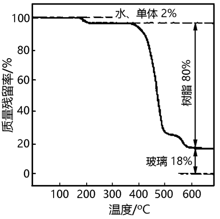 TGA用于分析聚合物中各种添加剂和杂质有独到之处,即快速简便。下图是玻璃钢成分分析曲线,有三个拐点,分别对应失水(100℃附近失水2%),和在400—600℃之间的两步分解(树脂共失重80%),最后不分解的是玻璃,失重率为18%。