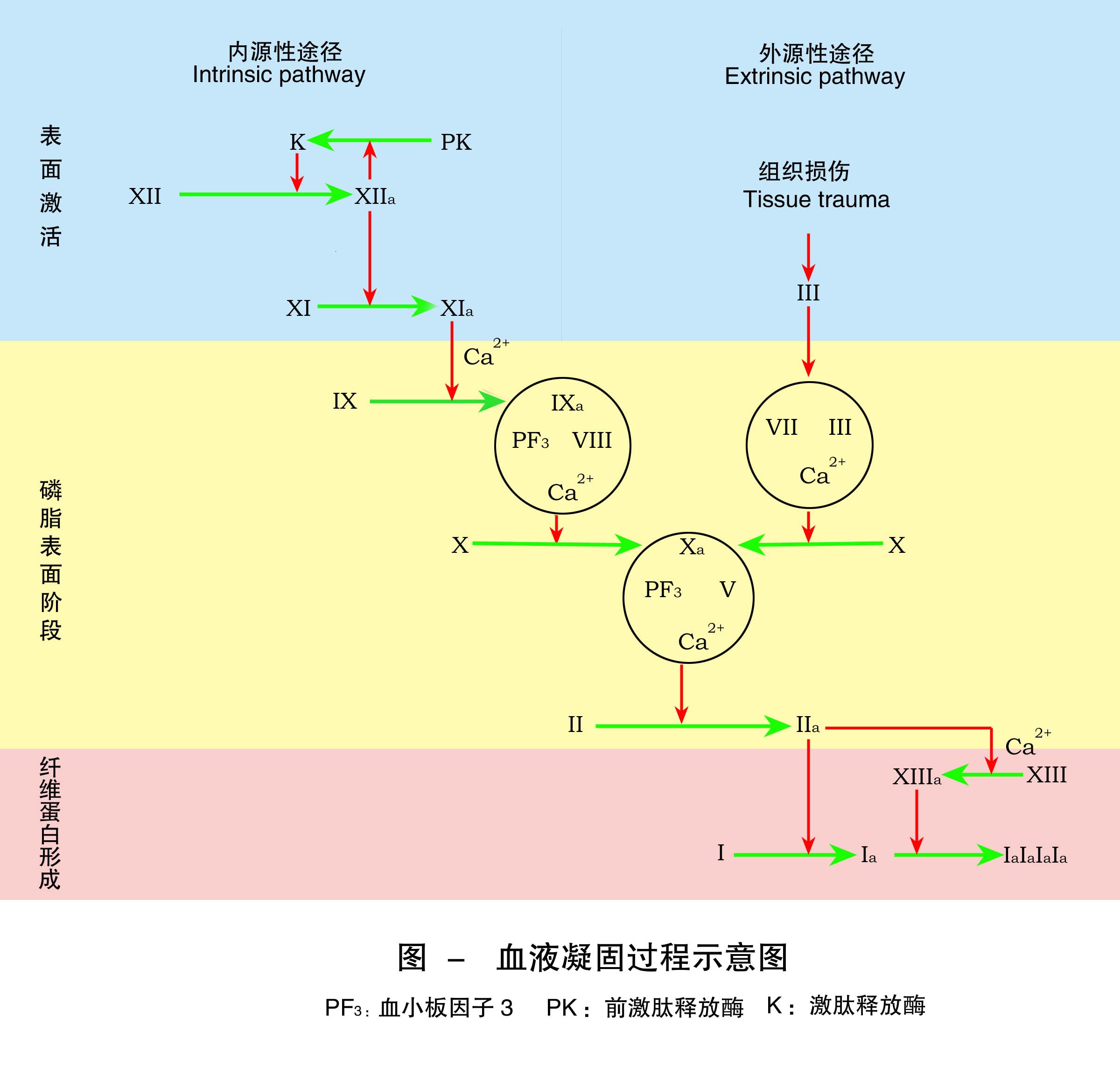 1.凝血酶原激合物的形成 凝血酶原激合物是因子Xa、V、Ca2+、PF3,共同形成的复合物。该复合物形成的关键是因子X的激活。根据因子X激活过程不同,分为内源性凝血和外源性凝血两条途径。