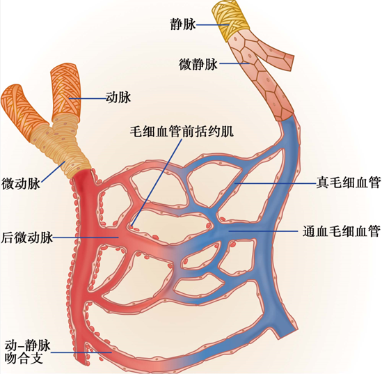 微动脉管壁平滑肌完整,其收缩和舒张可控制微循环的血流量。后微动脉是微动脉的分支,每根后微动脉向一根至数根真毛细血管供血。真毛细血管入口处有环形平滑肌,即毛细血管前括约肌,控制从后微动脉进入真毛细血管的血量。毛细血管的血液经微静脉进入静脉。微静脉的舒缩状态可影响毛细血管的血压和血流。