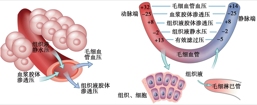 1. 毛细血管血压 在其他因素不变时,毛细血管动脉端血压升高,组织液生成增多,形成组织水肿。如炎症时,炎症部位的微动脉扩张,毛细血管前阻力减小,进入毛细血管的血量增多,使之血压升高,组织液生成增多,表现为炎性水肿。在毛细血管静脉端血压升高时,如其他因素不变则主要使组织液回流受阻。在右心功能不全时,由于右心室泵血减少,血液淤积在右心房内,静脉回流受阻,毛细血管静脉端血压升高,组织液回流减少,同时还逆行性引起毛细血管动脉端压力升高,组织液生成增加。在组织液生成增多时,组织液静水压增高,此时常伴有淋巴回流增多以排除增多的组织液,若组织液的增多超过了淋巴回流的代偿程度,就会产生水肿。在失水或失血后,由于毛细血管前阻力血管收缩,毛细血管血压降低,组织液的回流大于生成,细胞外液容量的大量缩减,机体表现为脱水。同时毛细血管血流量减少导致动、静脉端压力降低,组织液大量入血使血浆量有所恢复,对维持血压和血容量的稳定具有重要意义。