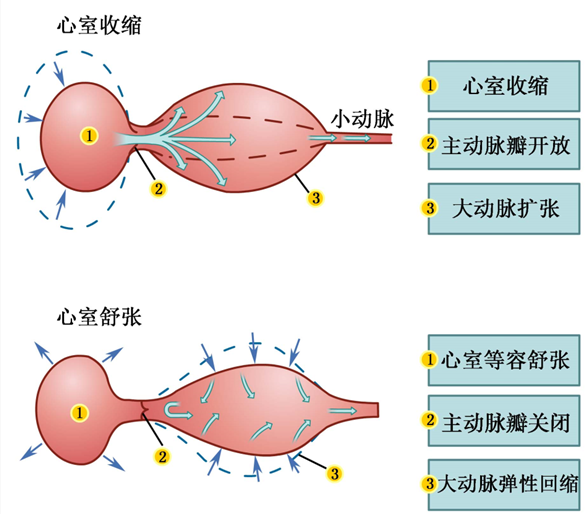 (2)心率 在其他因素相对不变时,心率加快,心输出量增多,血压升高。因心舒期缩短,此期流向外周的血量减少,使动脉内的贮血量增多。因此,心率增快时,舒张压升高的幅度大于收缩压,脉压减小。相反,心率减慢时,舒张压降低的幅度比收缩压降低的要大,脉压加大。