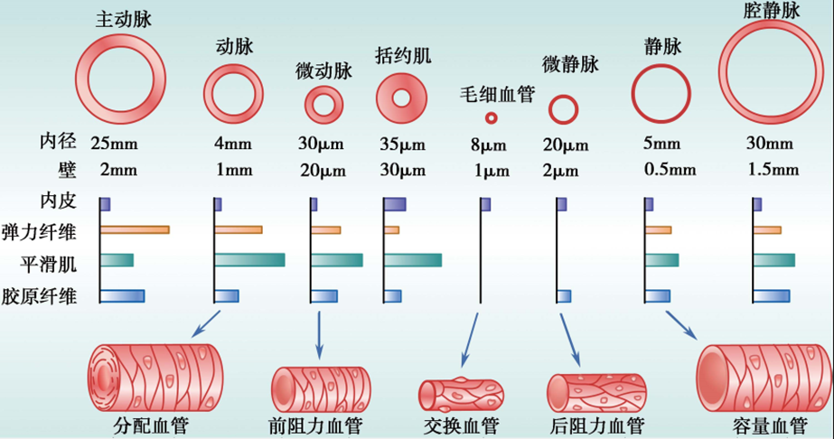 1.弹性贮器血管 主动脉和肺动脉主干及其大的分支血管的管壁厚,壁内含有丰富的弹性纤维,在外力作用下有较大的弹性和可扩张性。心室收缩射血所释放的能量,部分推动血液向前流动,另一部分则使大动脉扩张,以暂时贮存一定量的血液。心室舒期期,被扩张的大动脉发生弹性回缩,再把其中的血液推向外周,故将主动脉和大动脉称为弹性贮器血管。大动脉的这种弹性贮器作用,可以使心脏的间断射血成为血管系统中连续的血流,并减小每个心动周期中血压的波动幅度。